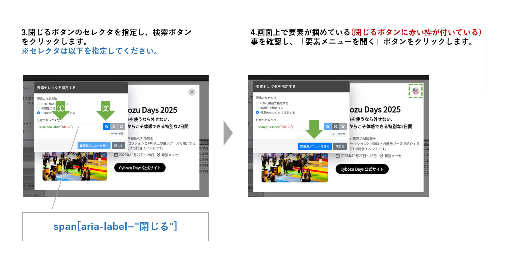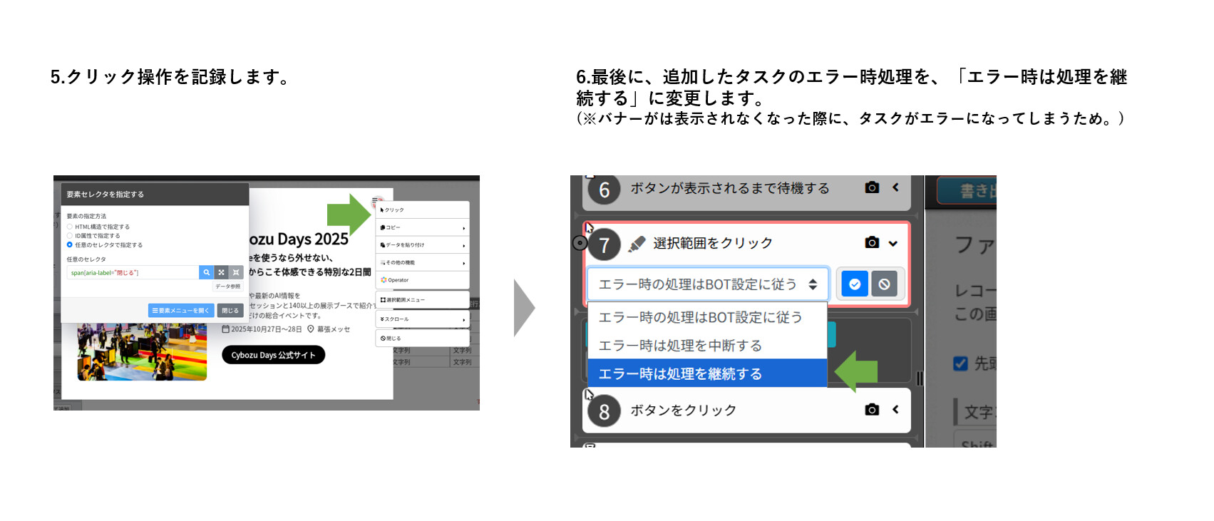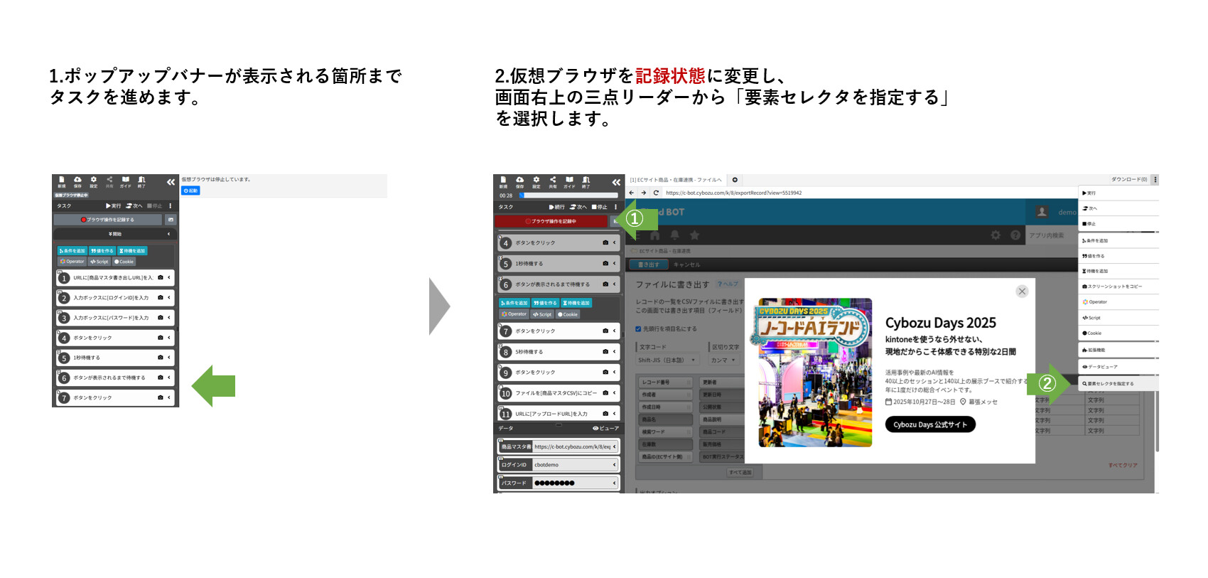 ・操作が安定するようにセレクタ指定で記録する。 ・ポップアップバナーが表示されなくなった際にエラーにならないようにタスク設定を調整する。